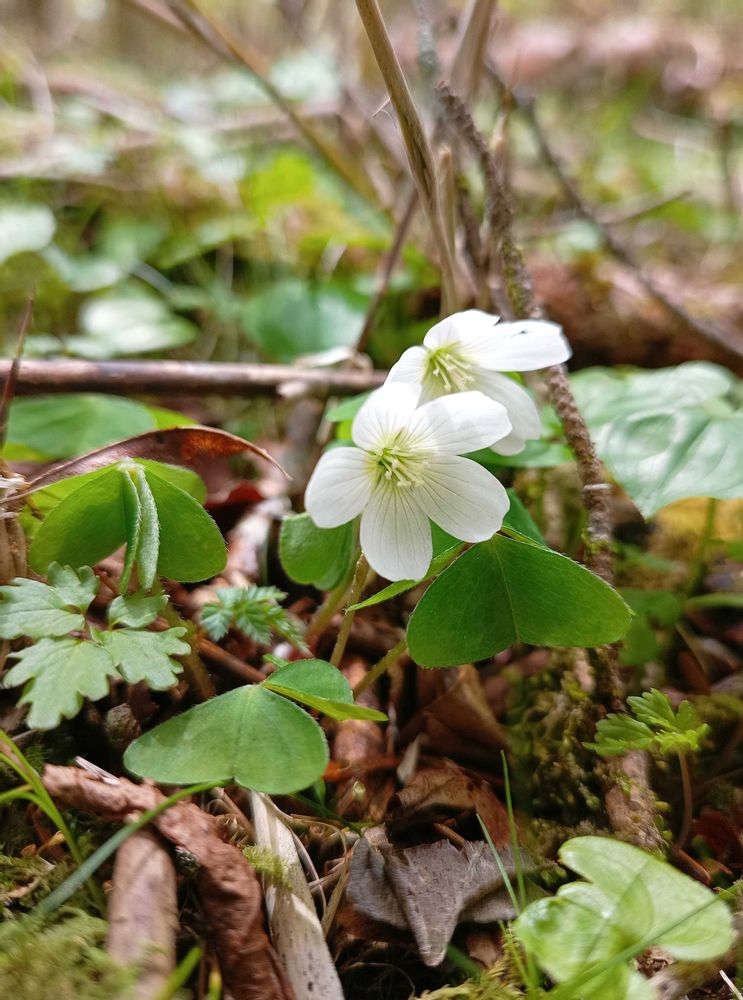 山地の木陰に生え、葉は3枚、小さな白い花を1個付ける。葉は、美しいハート形で3枚。その葉や茎には、シュウ酸を含んでいるため酸味がある。疲れた時にカタバミの葉を噛むと、酸味で刺激され元気回復になる。夜になると葉が閉じ、睡眠運動をする。