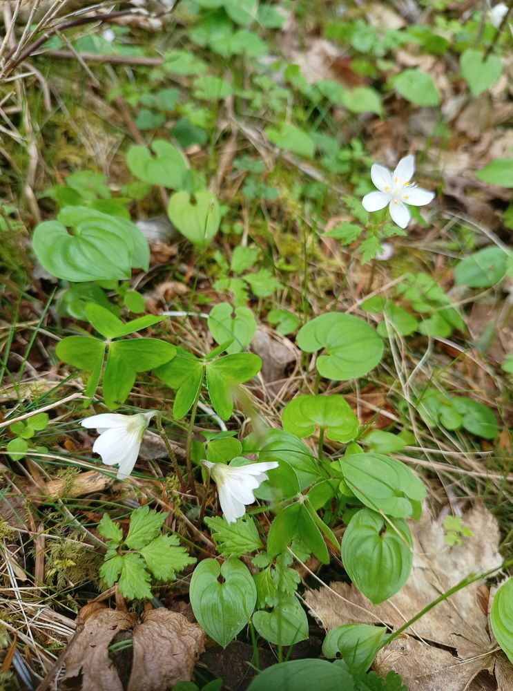 マイヅルソウも咲く環境、コミヤマカタバミではありませんか?葉の形が丸っぽいハート型では?私も大好きな花の一つです。ミヤマカタバミは杉林の林床など、割りと薄暗い環境が好きなようで葉の形が尖ったハート型。