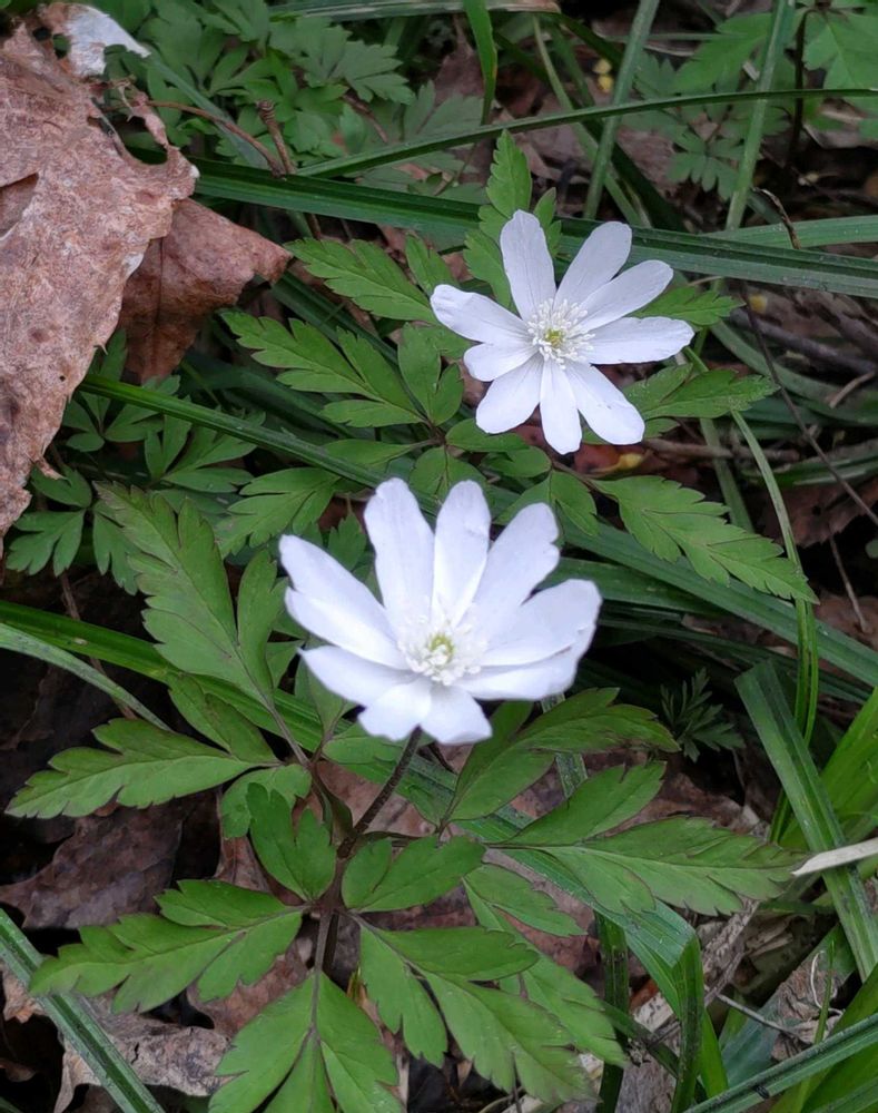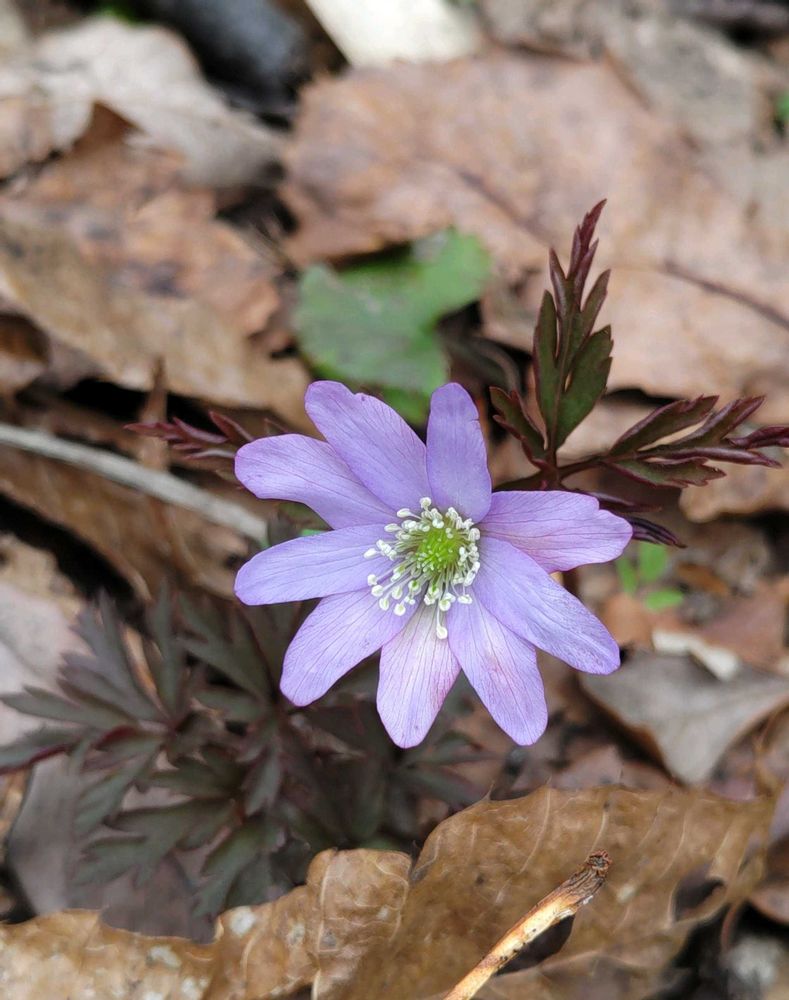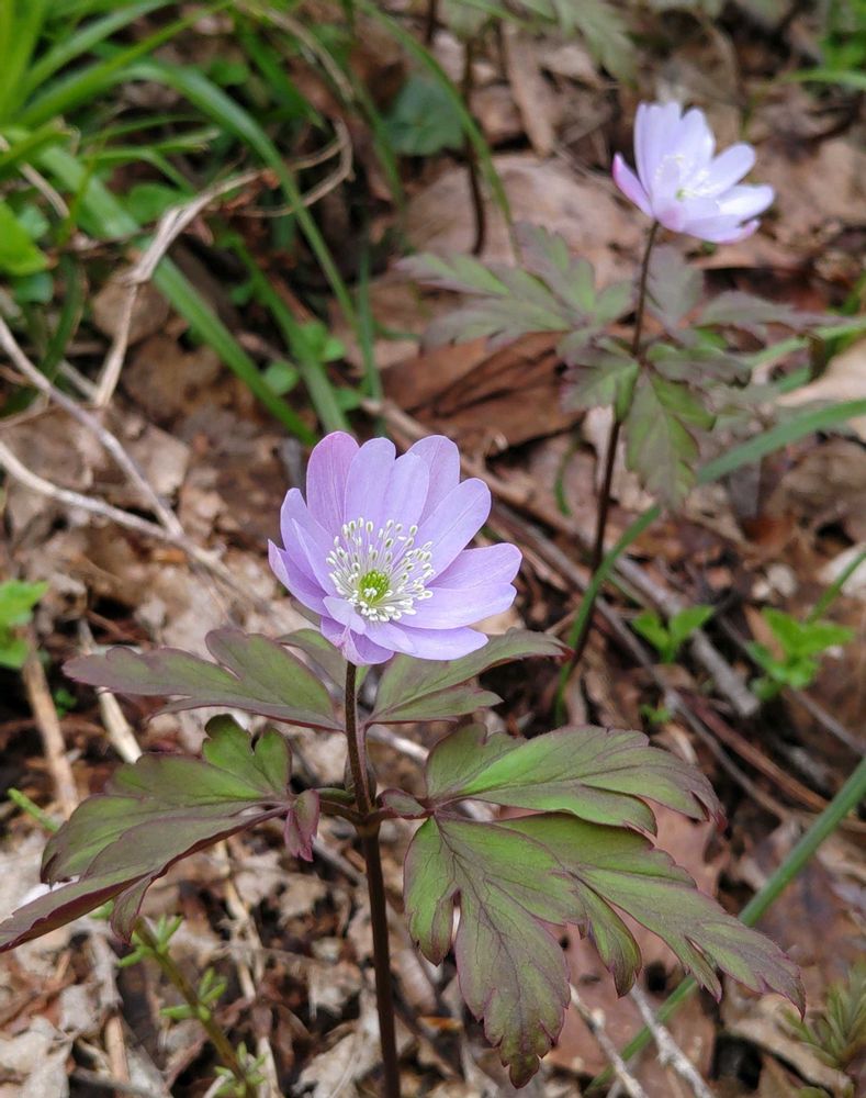 山形県源流の森の沢沿いに咲くキクザキイチゲ🩷💜🤍🌿