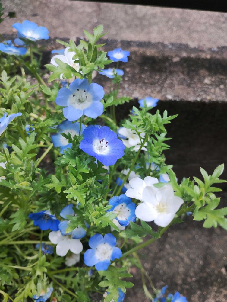 狭い土スペースに蒔いたネモフィラ、放置気味で遠目から眺める日々でしたが、よく見てみたら真っ白な花が咲いてた!😆