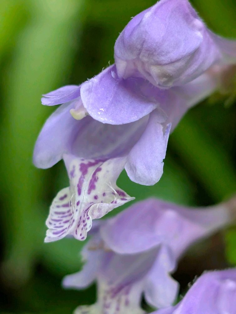 上唇は短く2裂。下唇は3裂し、中央れっぺんは大きい。下方に反り返って2つに浅く裂け、白地に濃紫色の模様があり、のど部の先端に開出する長毛がある。
