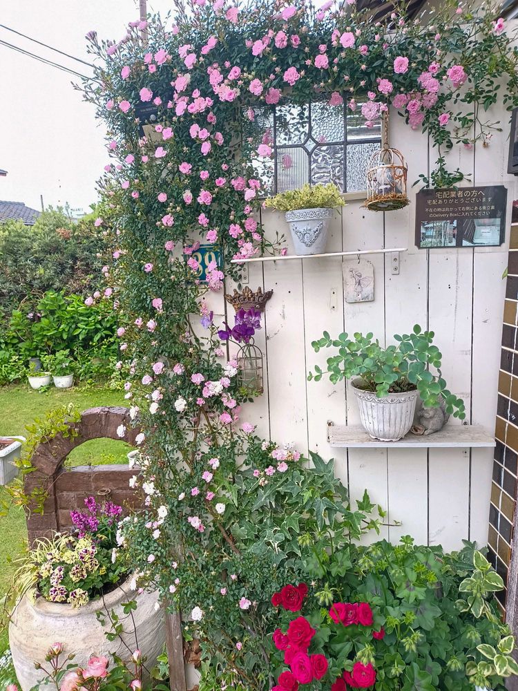 白い板壁にミニ薔薇夢乙女がピッタリですね(♡︎ˊ艸ˋ♡︎)💕💕