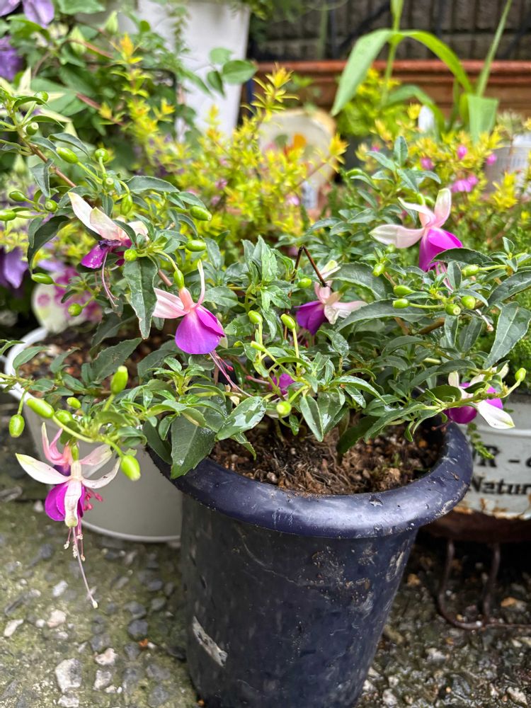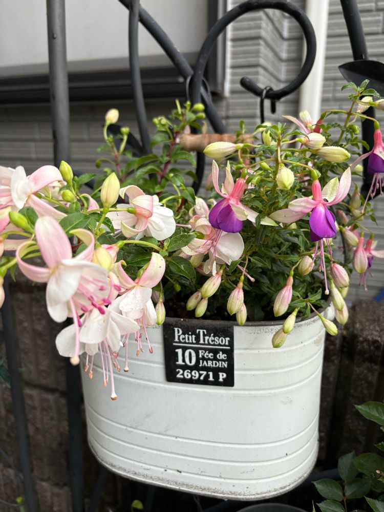 昨日園芸店巡りでお迎えしたフクシア、ピンクと白をブリキ鉢に入れる事に