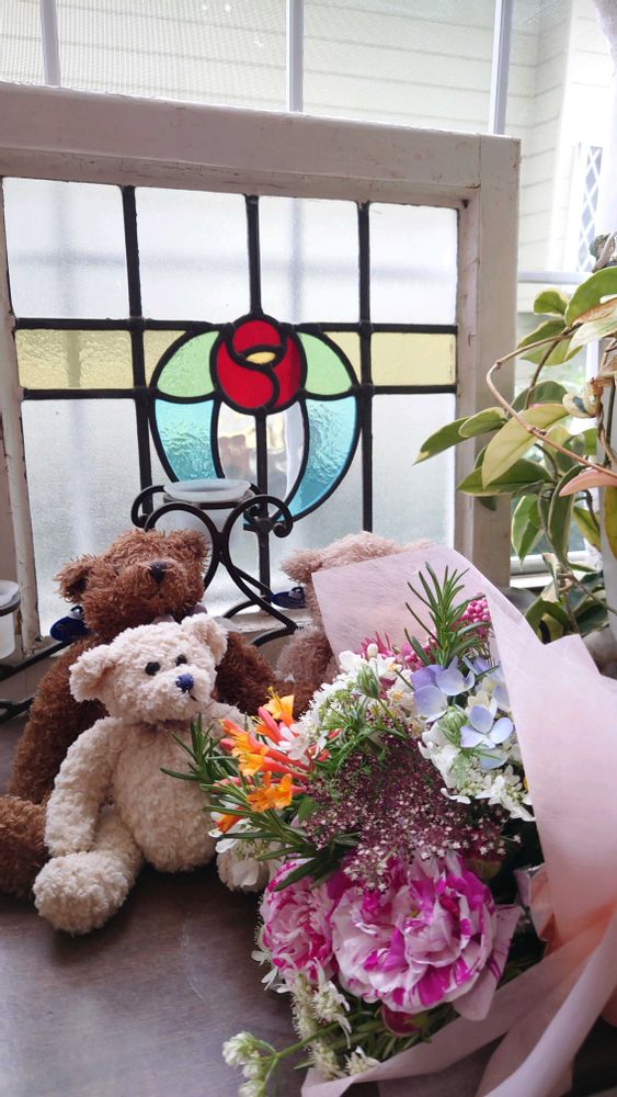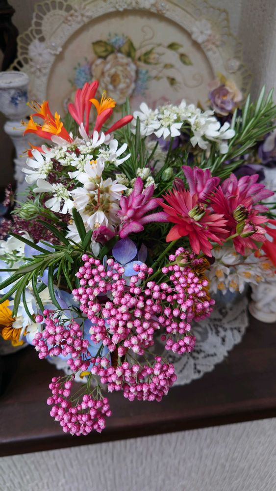 ありがとう〜友達のイメージで庭の花をカットするのも楽しみました〜後から、アレ?あれも入れたら良かったかも???なんて思いながら〜自己満足で作ったけど、あられちゃんやみんなに、素敵って言ってもらって〜友達も喜んでもらって良かったデス〜ありがとう〜🥰🩷💕