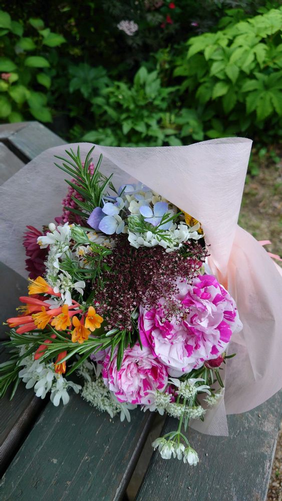 友達の誕生日に庭の花をカットして💐プレゼント〜包んでから慌てて写真撮ったけど、喜んでくれるかな?