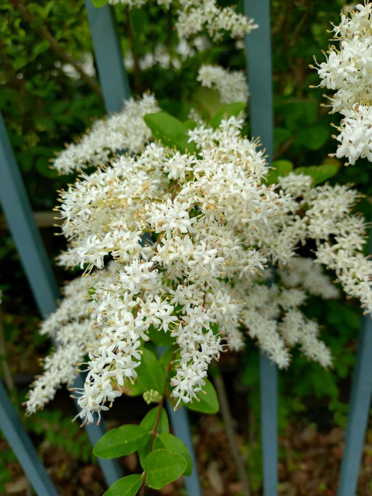 手入れをされていた方にお花の名前を聞いたら(プリベット)と教えて頂きました、和名は西洋イボタノキだそうです
