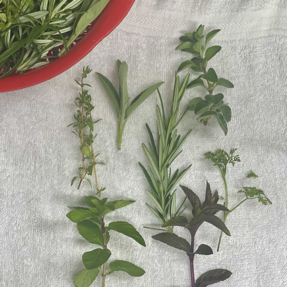 ボウルいっぱいのハーブはとってもいい香り🌿オレガノは初収穫。今夜はの晩ごはんはハーブx肉料理🍖