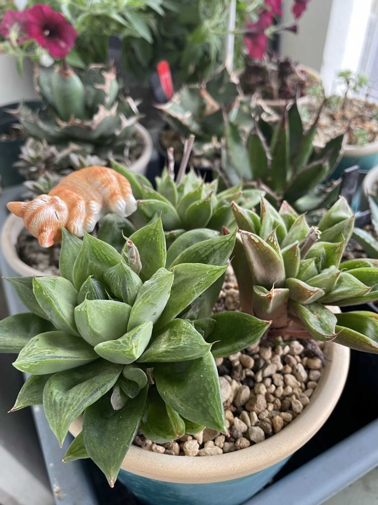 1️⃣ハオルチアはお花を全部カットして元肥を入れた土に植え直し。花友さんに頂いた猫ピックを挿してみた🐈♡
