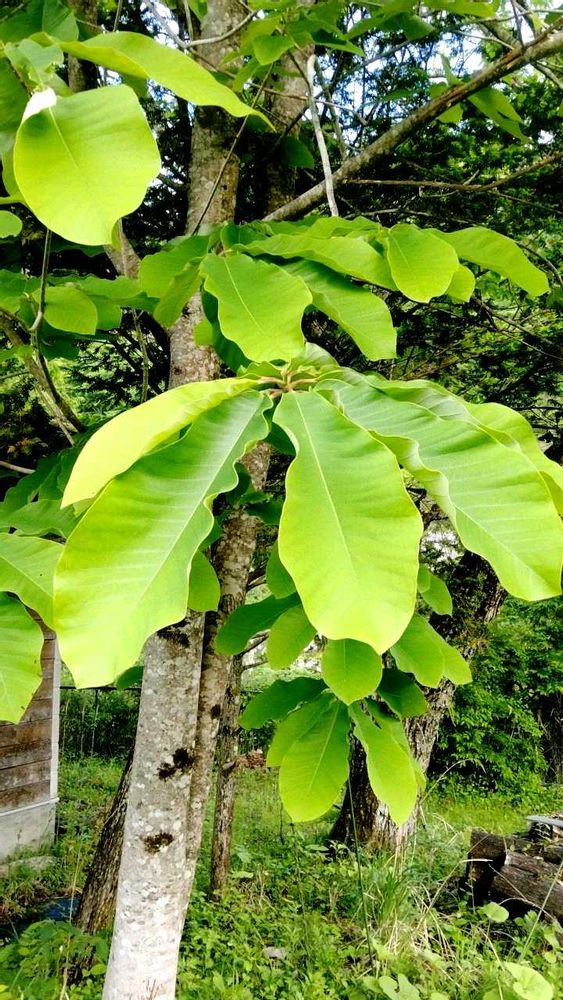 「今日のお花」ホオノキです。うちのは花は咲いていませんが、葉っぱが顔より長く、大きく育ってきました。樹高は6〜7m位はあります。