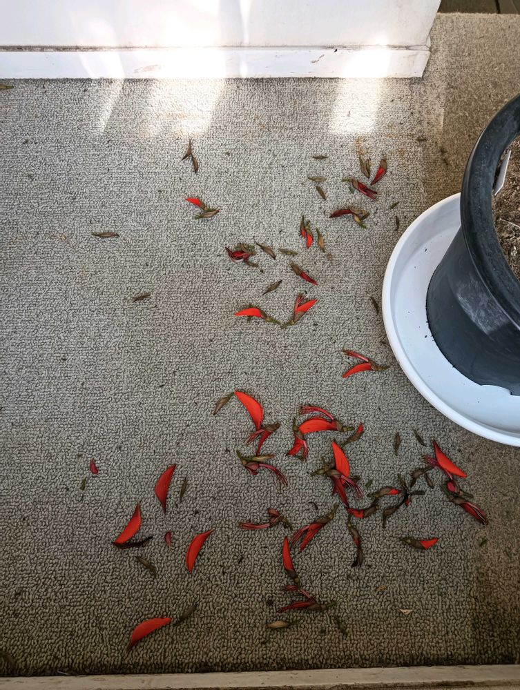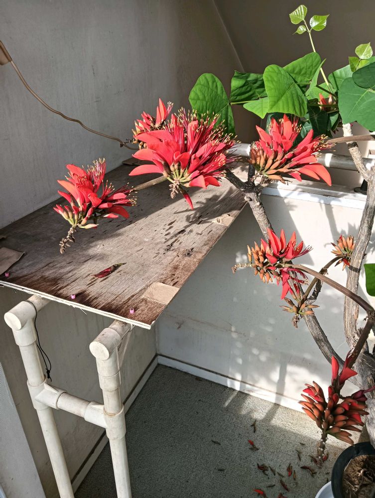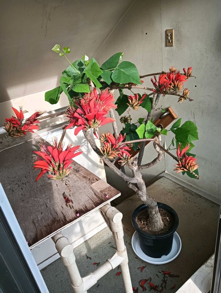 沖縄県花デイゴですが全体的に花弁が開いてきました。そして床がレッドカーペットになっています。ちなみに沖縄名木百選を調べたら本部町に樹齢200年、樹高13m.幹周5mのがありました。もし話せたらきっと琉球王国時代を語ってくれるのでしょうね!