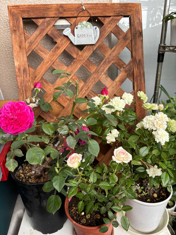①昨日、無造作に置いてる薔薇やミニ薔薇の鉢