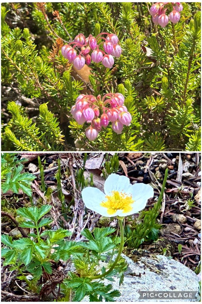 ずいぶん早いですけど、高山植物のアオノツガザクラとチングルマが咲いています。植物園で植栽されたものですね😊