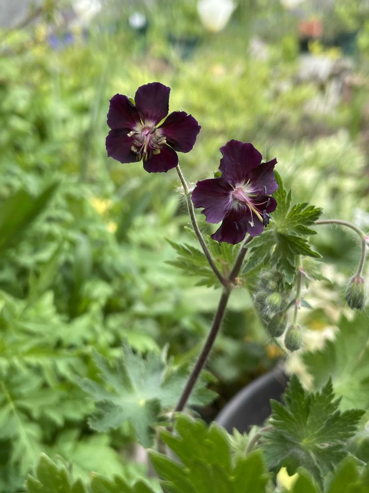 鉢植えにしたクロバナフウロがモリモリです。こぼれタネでいろんなところから出てきてくれます。