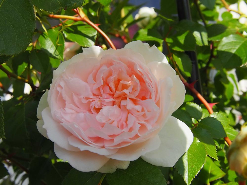 横張りで暴れ気味 枝が細くてトゲいっぱいなので剪定はどうしたものかと悩みましたが、オベリスクに括ると素敵に咲いてくれました♪