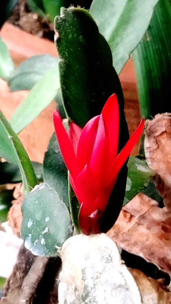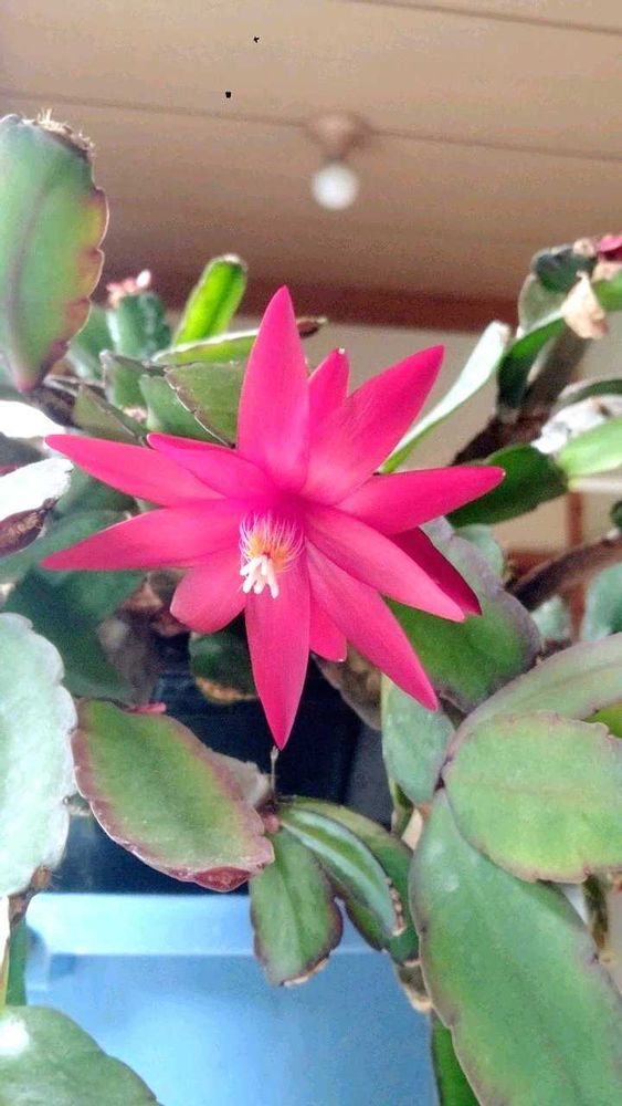 暖かい日差しの中、クジャクサボテンの一番花が開きました。二番花もスタンバイしています。