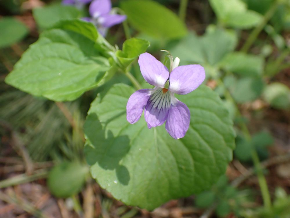 タチツボスミレより大型で、寒冷な多雪地に多いそうです。花は、直径2センチくらいで、紫色のすじが細かい網の目状になります。(①)