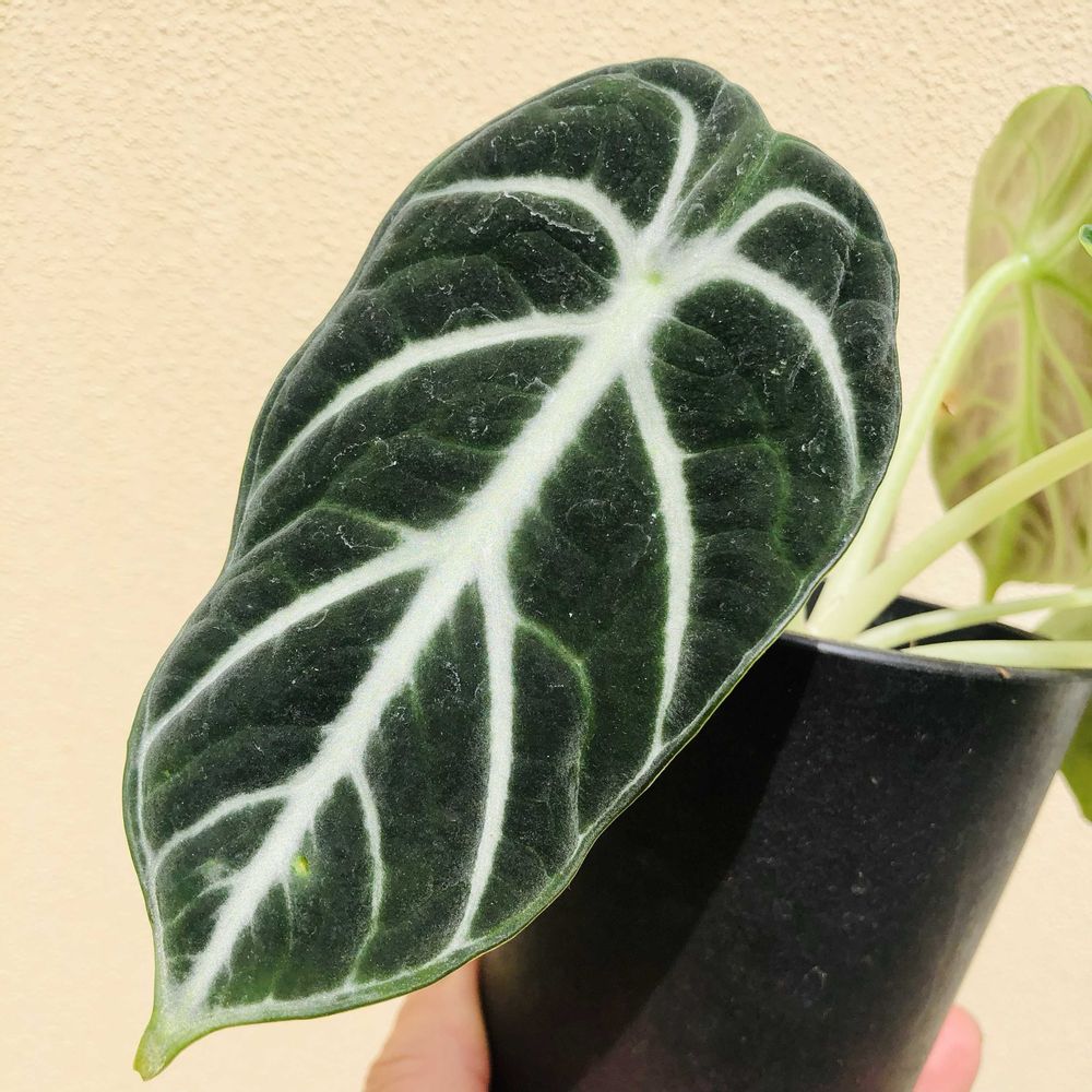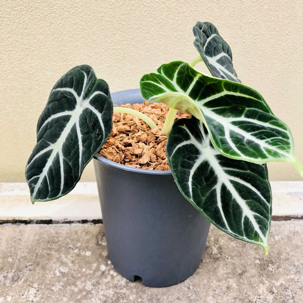 ベルベット調の美しい葉が特徴で、ブラックベルベットによく似た雰囲気のアロカシアニンジャ。