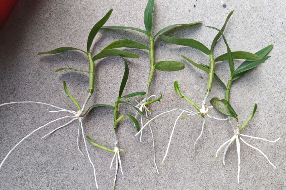 『デンドロビウムエンジェルベイビーグリーン愛』ですが、ひと鉢は高芽が出やすいタイプなのかわしゃわしゃなので、大きくなってしっかり根が出ているものを外し、濡らした水苔を巻き付けました