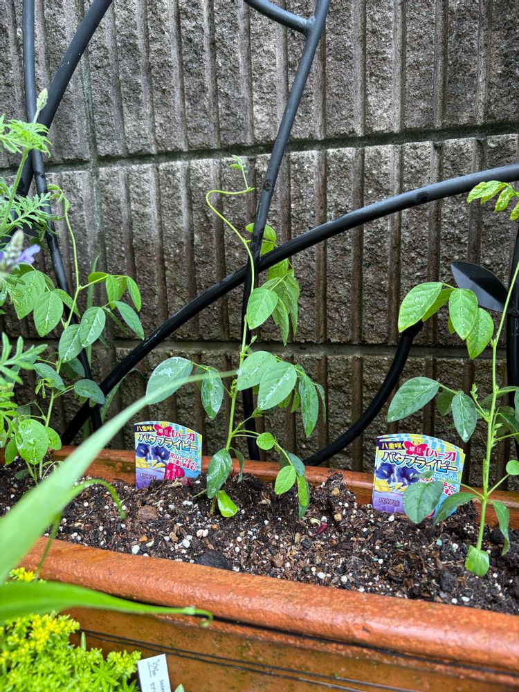 中庭のグリーンカーテン用は朝顔にしてアプローチに植えました