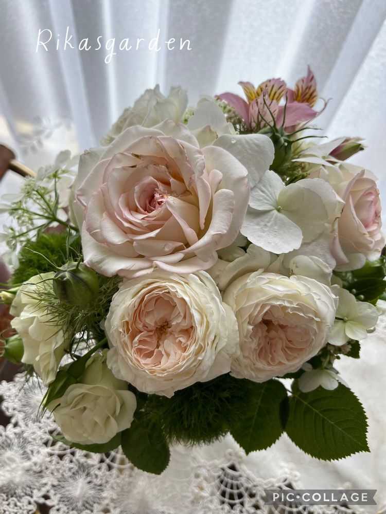 ①ミエル・ドゥ・フォレとプルミエラムールが同時に咲いてくれたので、一緒に飾ってみました。