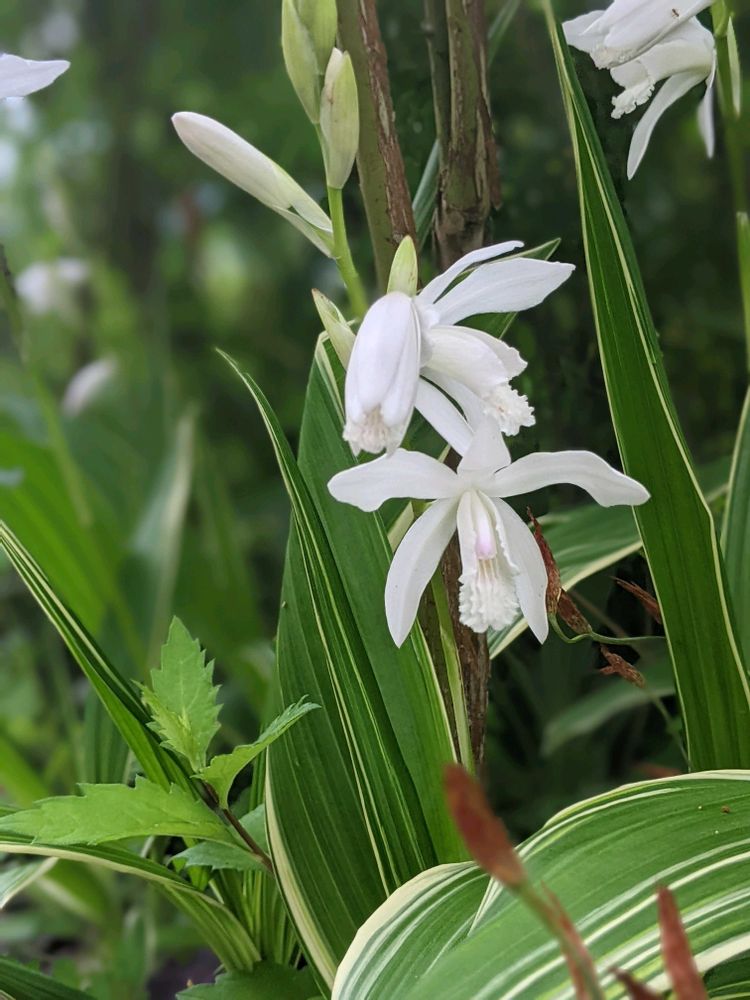 ユキヤナギの下ではシランの白花(斑入り)が咲き出しましたよ