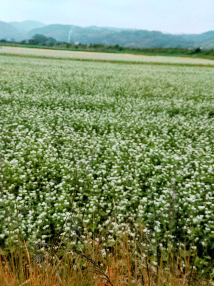 午後から、豊後高田市の花いろ温泉に行って来ました。温泉の道路側に、蕎麦畑が一面に真っ白🤍な花を咲かせてました。曇り空でしたが、綺麗でした。