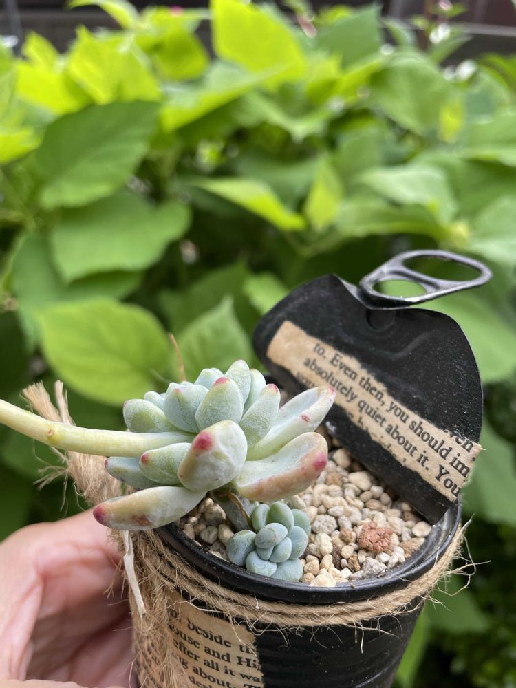 去年ロッティ丼に触れて折れてしまったひと枝をタニ友さんに頂いたリメ缶に植え🪴