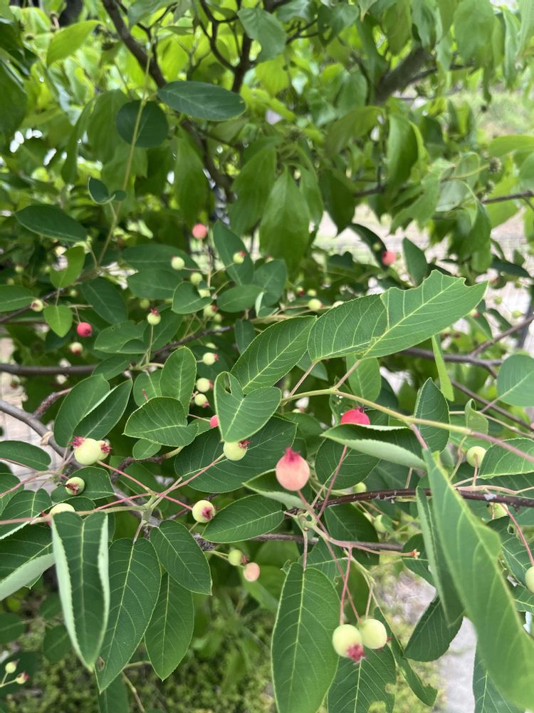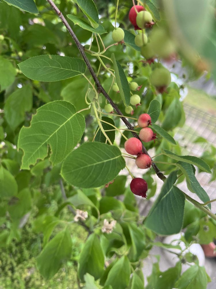 ジューンベリーの実が赤くなってきました。熟しているのは、紫っぽく濃い色になってきた時。