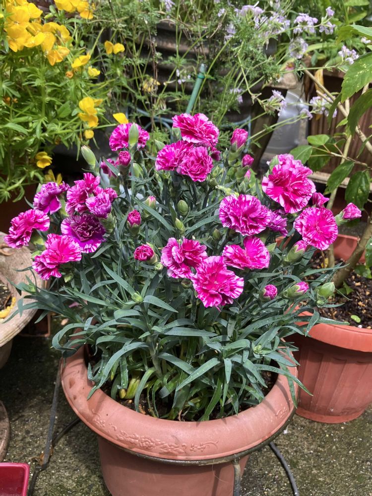 テレビ📺で、カーネーション頂いたら,しっかり陽に当てて、それからひとまわり大きな鉢に植え替え,花柄をまめにとると,蕾も大きくなり咲くと言ってたので、そうして見ました☺️
