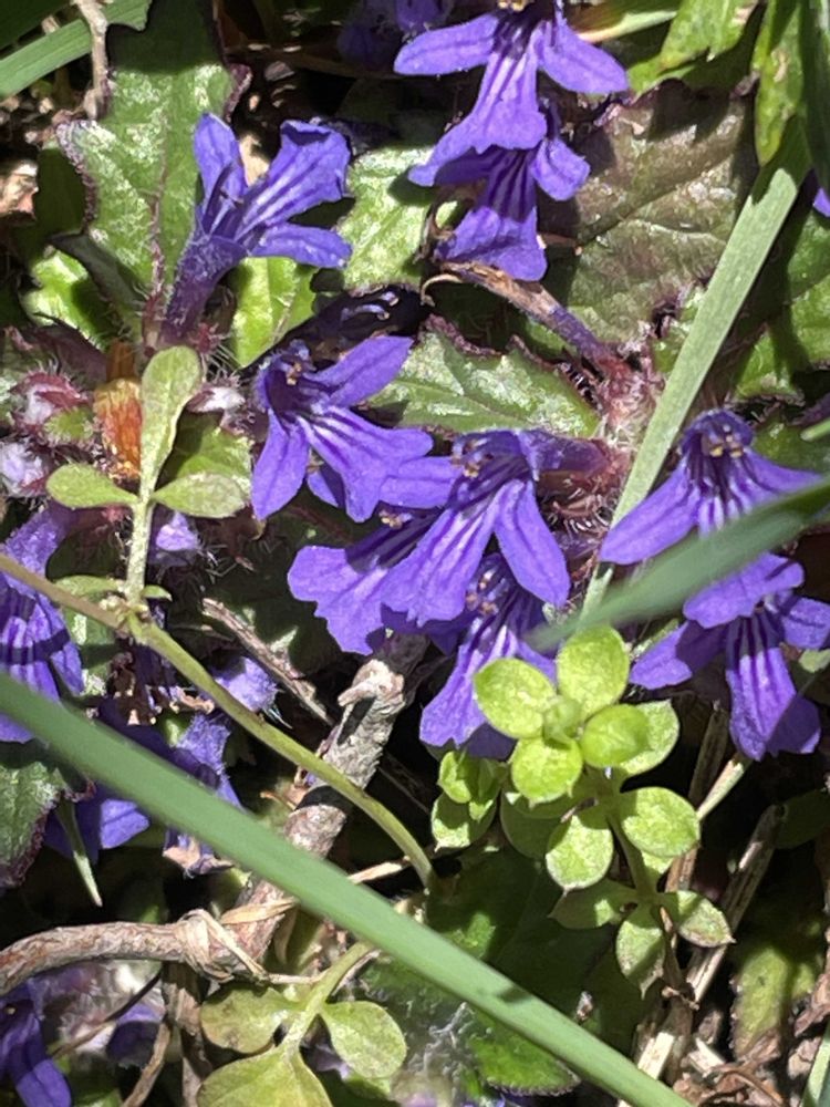 ①②キランソウ(金瘡小草)、シソ科キランソウ属の多年草。別名、ジゴクノカマノフタ(地獄の釜の蓋)。ミヤマキリシマの足元に、咲いていました。