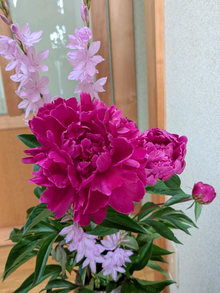 お隣さんから頂いた、深紅の芍薬と、めちゃんこ伸びてお花を付けた、我が家のワトソニアを合わせてみました♥🩷♥🩷