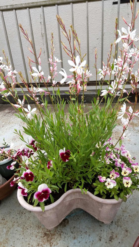 ③昨年から冬越ししたガウラ 回りをビオラ、パンジーが囲んでガウラを盛り立てています😄