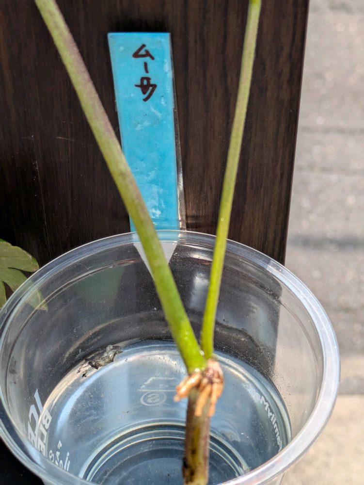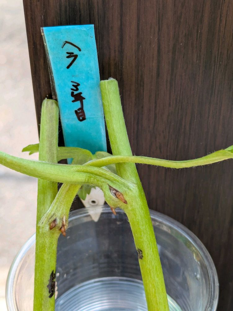 ②④水に漬けてたら細い根っこがでてきました😆😆わずか5日間で🤣🤣ここまで伸びるとは😍