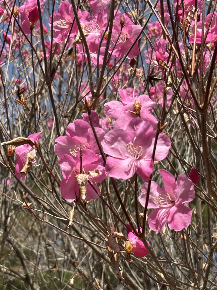 あの山の道路沿いに、ぽつんぽつんとアカヤシオの木がありました。仰る通り何にも無い時期なので濃いピンクが妙に目立ってました😊