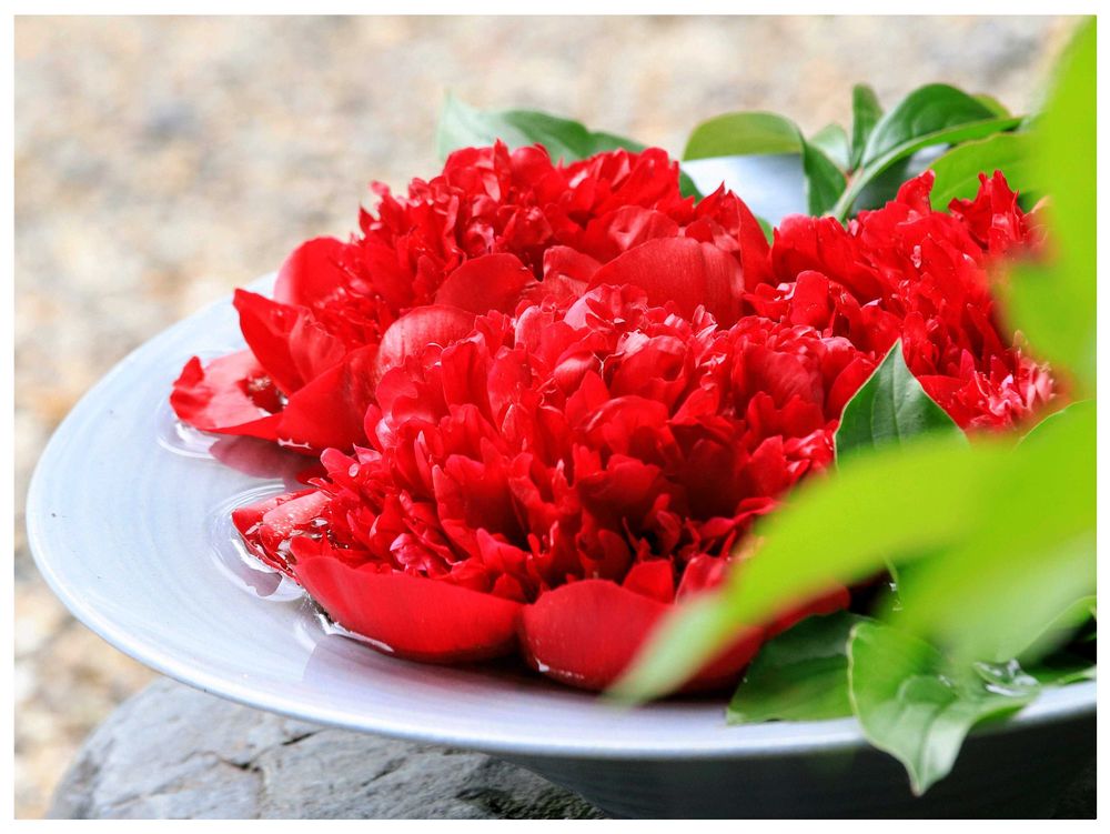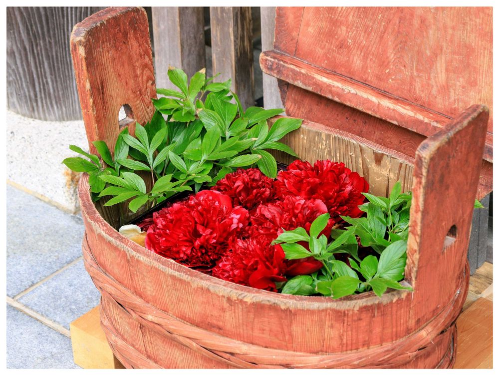 「火鉢」や「木製のおひつ」などに生けたシャクヤクの花手水です🍊