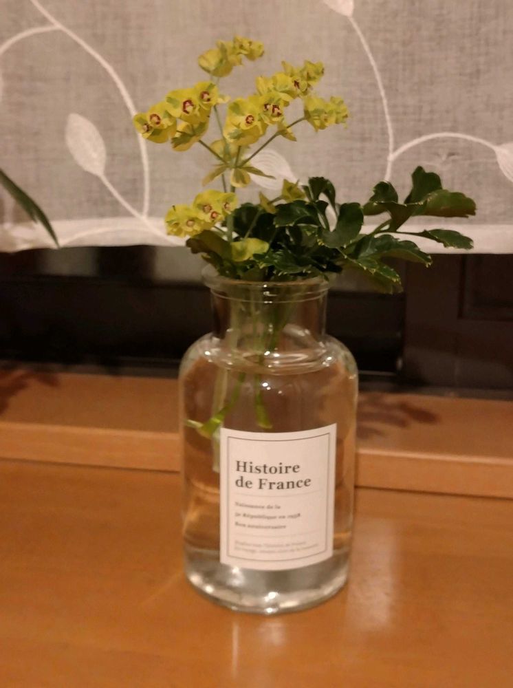 DAISOの瓶で庭のユーフォルビアと、切り花の余りのポリシャス🌿