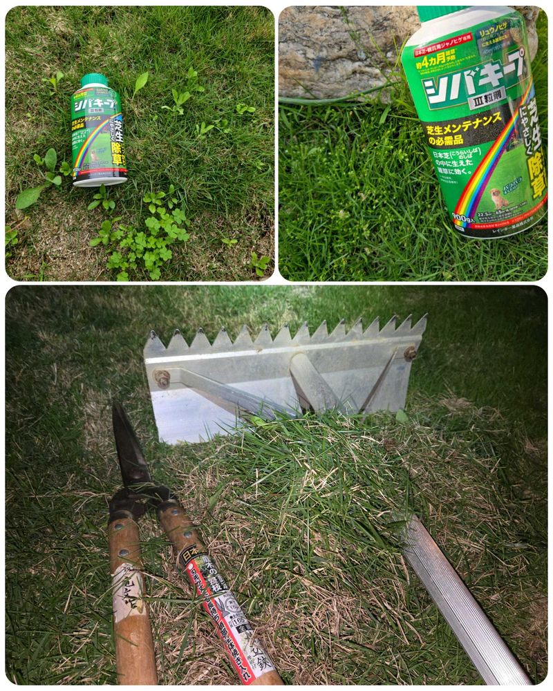 雨で芝にこべり付いた猫の落とし物が無いうちにと芝カットとサッチ取りもしました(^_^;)