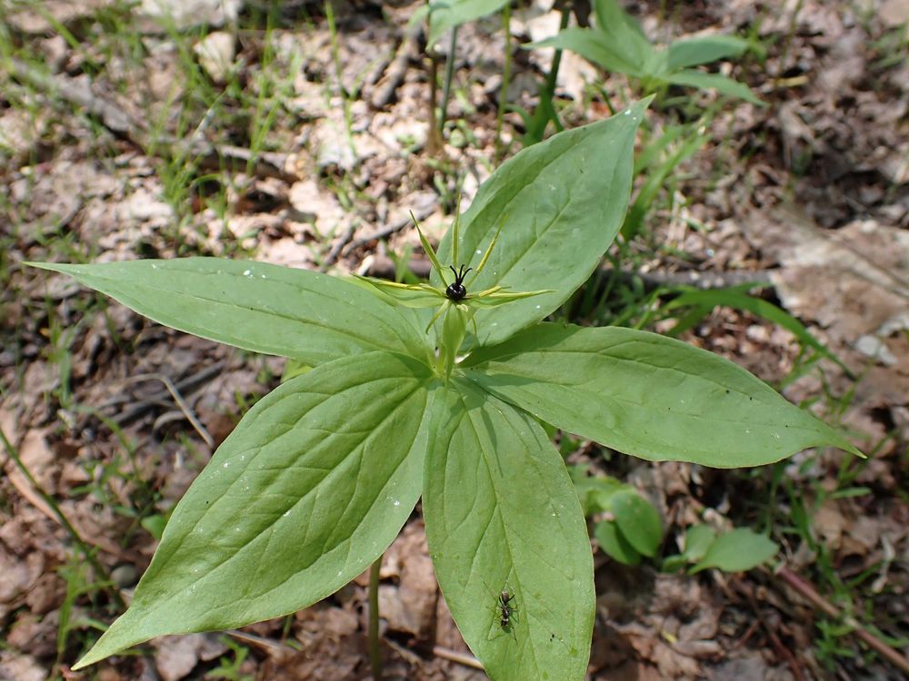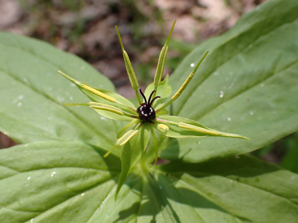 最初見つけた時は、ツクバネソウかと思いました。家に帰って調べてみると、葉が4枚ではありませんでした。そして、雌蕊と、雌蕊の根元の色が違っていました。