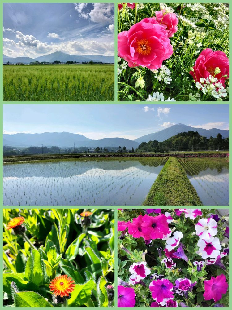 田植えが終わった目の前の田んぼが水鏡になり風景が映ってキラキラ✨️