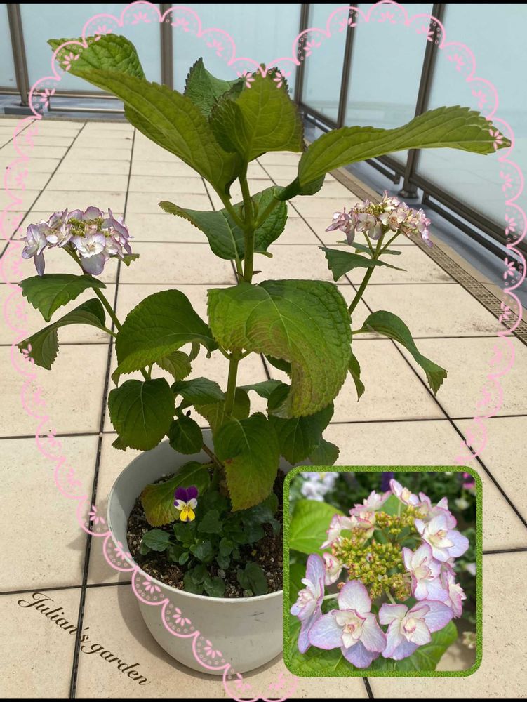 ②「〇 〇KO」さんと言う名前の付いたアジサイの挿した苗木を昨年頂き今年はまだ咲かないかなと思っていたら 蕾が2つ付き 咲き始めました😍
