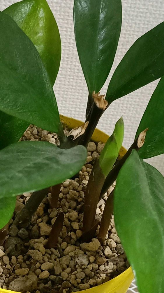 頂きもののザミオクルカスさんの枝をカットして挿し木しといたら新芽がようやく出てきました🌱枝が伸びてくると思ってたら土からニョキニョキ新芽がでてきました🥰