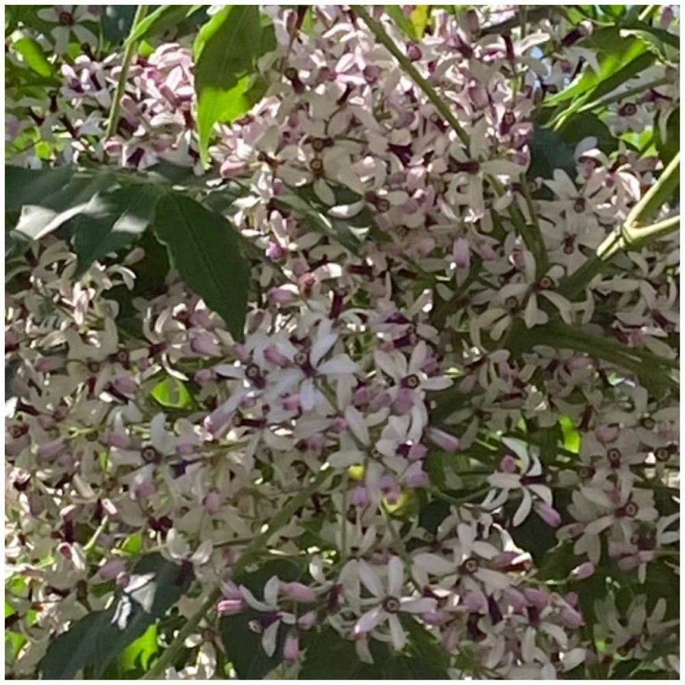 センダンは落葉高木で、花期は5月~6月です。淡紫色の小さな花を穂状に咲かせ、まるで小さな風車のように見えます。花びらは細長く、びっしりと咲く様子が特徴です。秋には白い実がなります♪