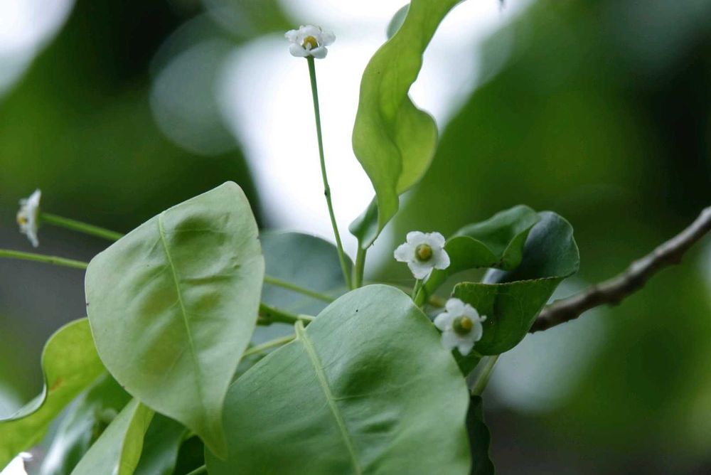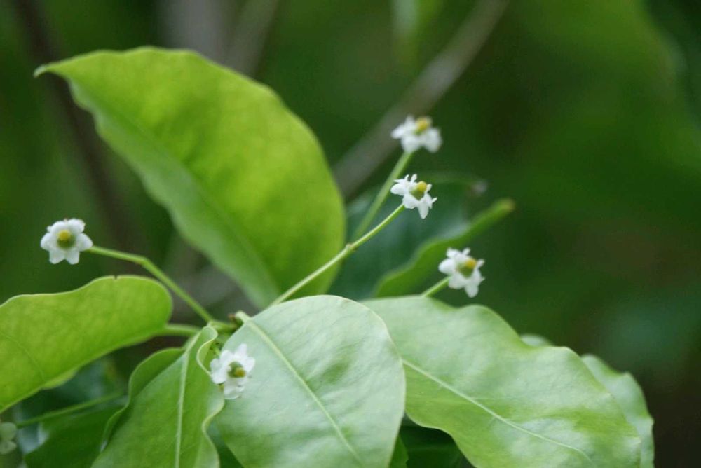 雌花は長さ3、4㌢の先に1個だけつき、直径4㍉白色5、6弁花。花柄の途中に小さな苞葉がつく。
