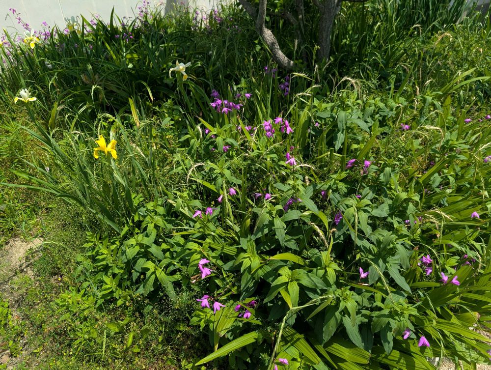 雑草がアイリスや紫蘭よりもいっぱい生えている