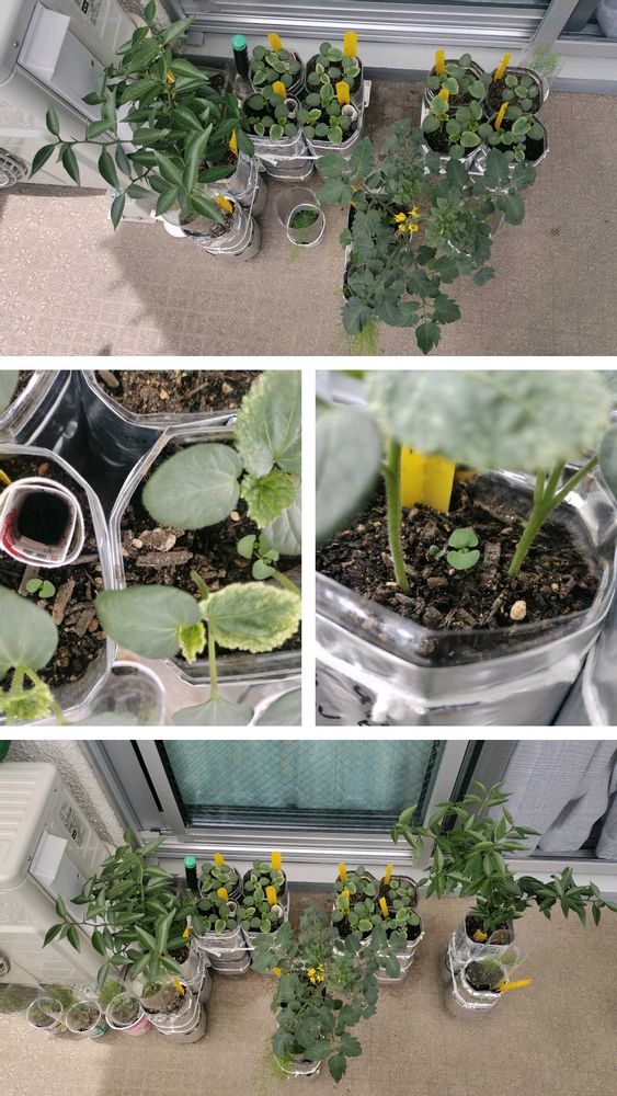 出た芽が駄目になった1鉢と、ミニトマトの鉢にはバジルを6粒ずつ種蒔き。