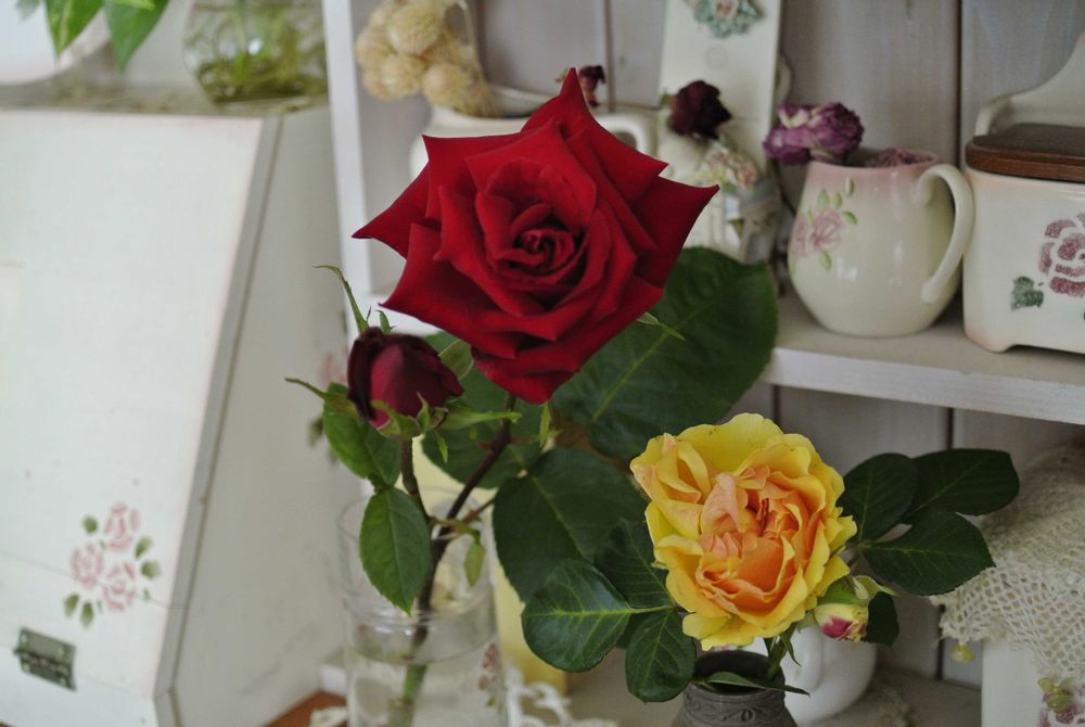 2枚目は朝カットした庭の赤い薔薇とのコラボ。