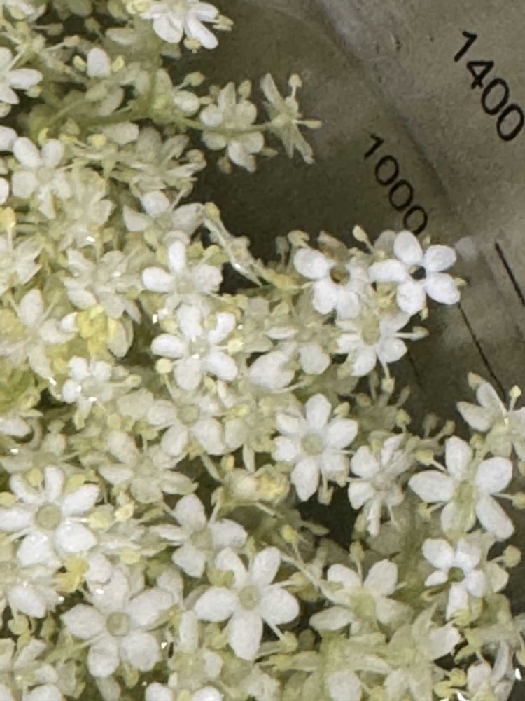 花を集めてみたら500gほどあったので、エルダーフラワーコーディアル(シロップ)を作ってみました🎵