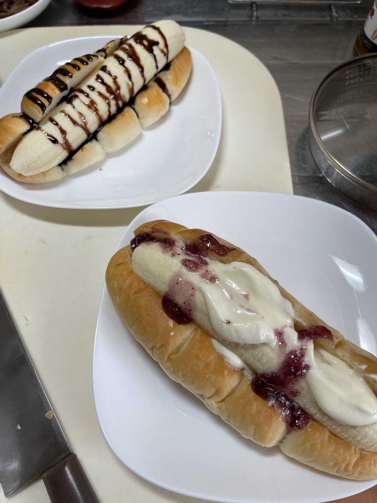 っとここまでは良かったんですがこのあとがいただけませんでした👉👎🏿 「いざっ!食さん‼︎」としたその時です。 下から持った孫はバナナを上から落っことし、上から持った次男の嫁さんはパンが切れ込みから縦にまっぷたつに裂けてしまって..2本のバナナがテーブルをコロコロと😝😝😝