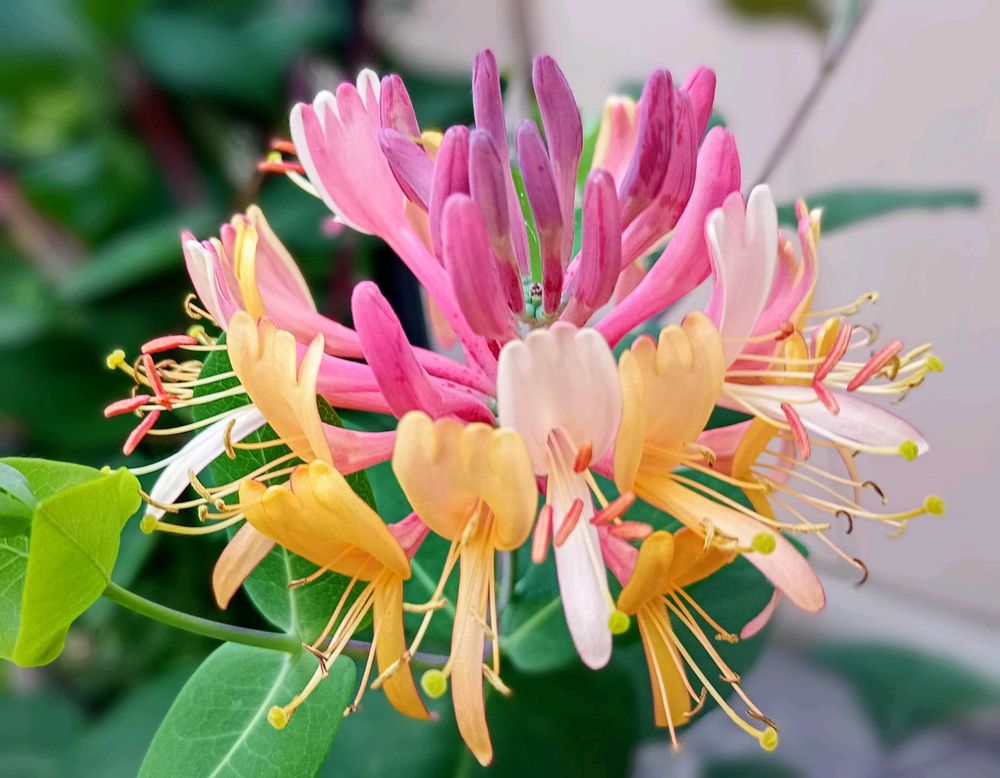 漢字では『忍冬』 4picめシベ1本でてきた🔍️❣️ 鉢植えですが、伸び伸びとツルも伸ばし…。 シベもまた可愛いですぅ〜🫶😊💞