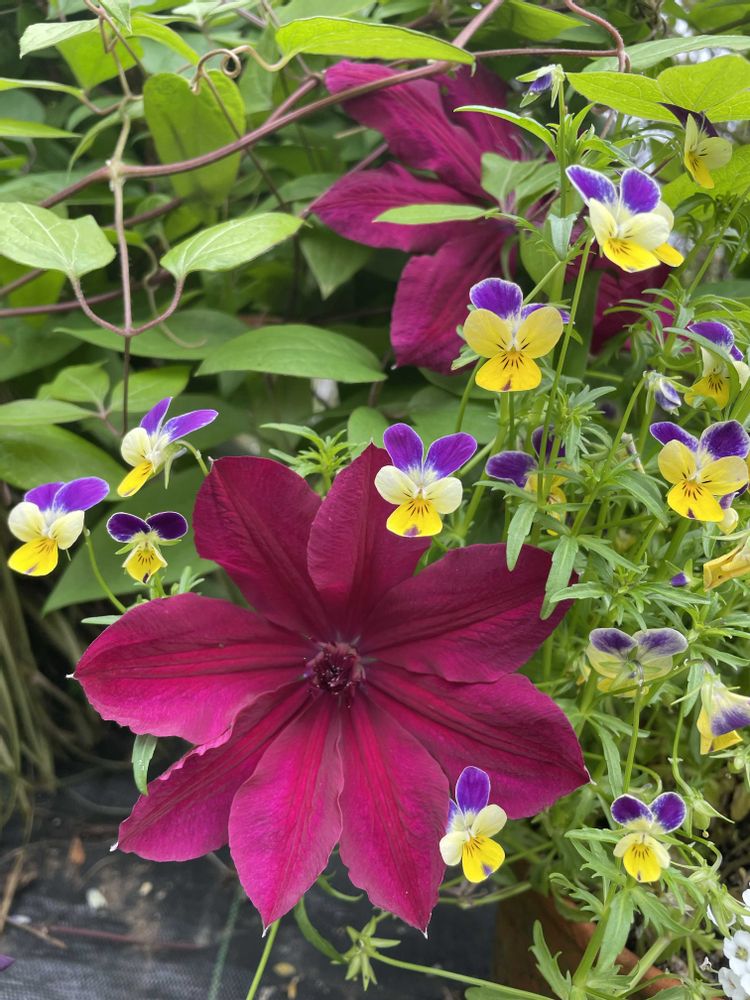 こんにちは😃クレマチスもビオラも目立ってるね〜😊紅葉🍁春でも赤い葉っぱがあるね^_^